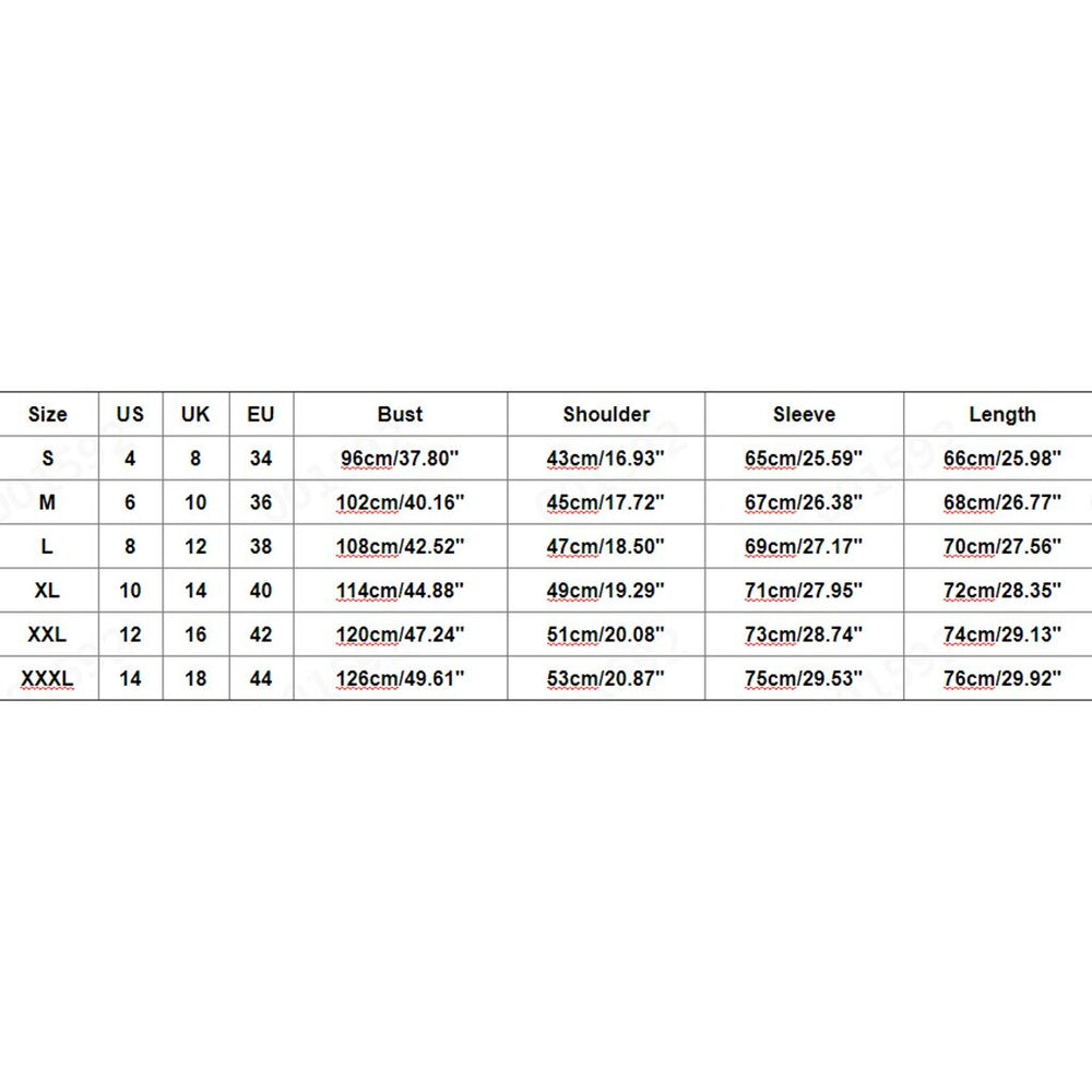 Size US UK EU Bust Shoulder Sleeve Length S 4 8 34 96cm/37.80'' 43cm/16.93'' 65cm/25.59'' 66cm/25.98'' M 6 10 36 102cm/40.16'' 45cm/17.72'' 67cm/26.38'' 68cm/26.77'' L 8 12 38 108cm/42.52'' 47cm/18.50'' 69cm/27.17'' 70cm/27.56'' XL 10 14 40 114cm/44.88'' 49cm/19.29'' 71cm/27.95'' 72cm/28.35'' XXL 12 16 42 120cm/47.24'' 51cm/20.08'' 73cm/28.74'' 74cm/29.13'' XXXL 14 18 44 126cm/49.61'' 53cm/20.87'' 75cm/29.53'' 76cm/29.92''