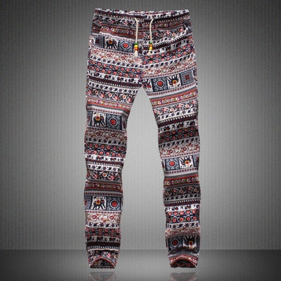 Sportliche Freizeithose für den Herren, im HipHop-Stil, mit Taschen und Kordelzug, aus reichlich gemusterten Leinenstoff und frischer Farbgebung. Passend für alle Jahreszeiten.