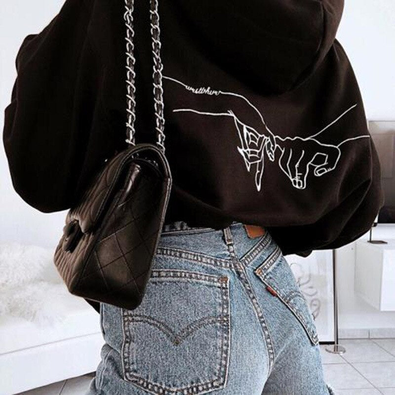 Schwarzes Damen Hoodie aus Kunststoff, mit apartem Grafikmotiv auf der Rückseite der Jacke. Für Frühling und Herbst. Brand Name: ProwowMaterial: PolyesterSleeve Style: RegularHooded: YesOrigin: CN(Origin)Season: Spring/AutumnDecoration: PatchworkStyle: CasualItem Type: PulloversSleeve...