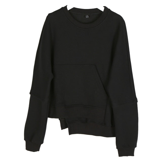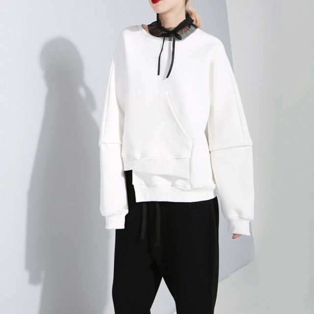 Damen Sweatshirt aus Baumwollmix, mit witzigem Schnitt und Rundhals, assymmetrische Länge, in Schwarz/Weiß, im Frühling und Herbst anzuziehen