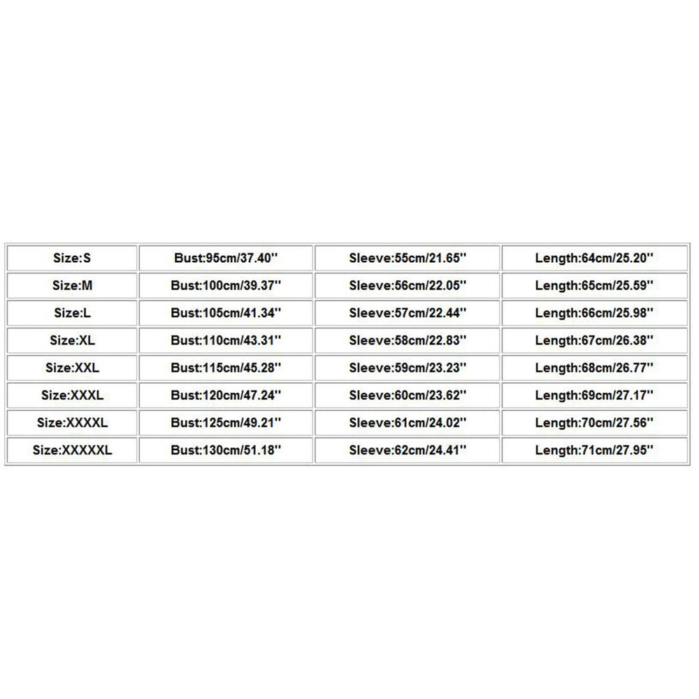 Größe Büste Ärmellänge S 95cm/37.40'' 55cm/21.65'' 64cm/25.20'' M 100cm/39.37'' 56cm/22.05'' 65cm/25.59'' L 105cm/41.34'' 57cm/22.44'' 66cm/25.98 XL 110cm/43.31'' 58cm/22.83'' 67cm/26.38'' XXL 115cm/45.28'' 59cm/23.23'' 68cm/26.77'' XXXL 120cm/47.24'' 60cm/23.62'' 69cm/27.17'' XXXXL 125 cm/49,21 Zoll 61 cm/24,02 Zoll 70 cm/27,56 Zoll XXXXXL 130 cm/51,18 Zoll 62 cm/24,41 Zoll 71 cm/27,95 Zoll